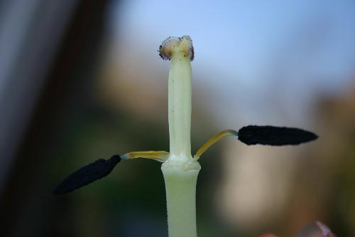 Zunächst hatten wir nur nach den Kronblättern geschaut. Welche weiteren Teile neben den Kronblättern bei einer Tulpenblüte vorkommen, siehst du im Foto rechts. Bei diesem Blütenrest fehlen sämtliche Kronblätter und es sind nur noch in der Mitte der Stempel und außen zwei der Staubblätter vorhanden. | ![]() |