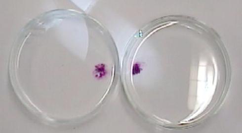 In der linken Petrischale wurden Kalium- permanganat- Kristalle zu Wasser von