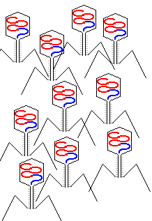 Und diese Misch-DNS aus Phagen-DNS und Bakterien-DNS wird in die Phagenköpfe eingebaut. Nach der Lyse der Bakterie werden die abgebildeten "Phagen" frei. |