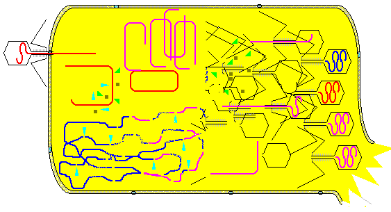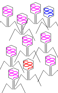 Bei der Genübertragung durch Transduktion sind die Bakterien auf Phagen angewiesen, die sich eigentlich in ihnen vermehren lassen und dabei die Bakterien zerstören. Die DNS in den Köpfen ist farblich unterschieden: ursprüngliche Phagen-DNS, replizierte Phagen-DNS, nicht abgebaute Bakterien-DNS. Manchmal passiert, dass nicht abgebaute Bakterien-DNS in einen Phagen-Kopf eingebaut wird. |