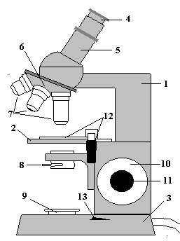 2. Objekttisch 3. Fuß (mit Beleuchtungseinrichtung) 4. Okular 5. Tubus 6. Revolver 7. Objektiv 8. Blende 9. Lampe 10. Grobtrieb 11. Feintrieb 12. Kreuztisch mit Einstellgriff 13. Schalter für die Beleuchtung |