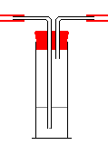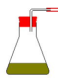 Wir geben etwas Wasser, Hefe und einen Spatel Traubenzucker in das Becherglas, rühren mit dem Glasstab die Hefe gut auf, geben dann das warme Wasser dazu, schütteln zur besseren Verteilung und schütten die Lösung in den Glaskolben. Entsprechend der Abbildung verbinden wir den Glaskolben mit Stopfen und Glasrohr mit der Gaswaschflasche, in der sich unten Kalkwasser befindet.
