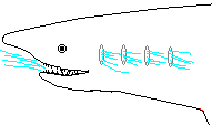 | Beim Hai, einem urtümlichen Knorpelfisch, finden wir noch einzelne Kiemenspalten, durch die das Atemwasser wieder nach außen gelangt. Diese Kiemenspalten entstehen in der Embryonalentwicklung im Bereich des Kiemendarmes. Innen im Kiemendarm bilden sich Einbuchtungen, sogenannte Kiementaschen. Ihnen gegenüber, an der Körperaußenseite, entwickeln sich ebenfalls Einbuchtungen, die Kiemenfurchen. Kiementaschen und Kiemenfurchen wachsen aufeinander zu und sobald eine Öffnung durchgebrochen ist, haben wir Kiemenspalten. |