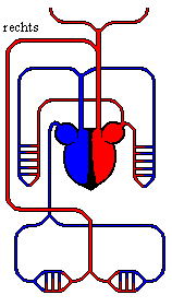 Das Herz besteht aus zwei Vorkammern und zwei vollständig getrennten Hauptkammern. Die rechte Vorkammer bekommt sauerstoffarmes Blut aus dem Körper, die linke Vorkammer sauerstoffreiches Blut von der Lunge. Über die rechte Hauptkammer gelangt das sauerstoffarme Blut über die Lungenarterie zur Lunge. Die Linke Hauptkammer bekommt über die Lungenvene das sauerstoffreiche Blut und leitet es über die Aorte in den Körper. Die Körperschlagader verläuft auf der linken Körperseite. |