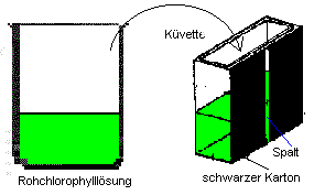 In den Strahlengang des Projektors wird eine Glasküvette mit Rohchlorophylllösung (eventuell mit Aceton verdünnt) geschoben und die Auswirkungen auf das Spektrum beobachtet.