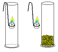 | b) Die brennende Kerze halten wir zunächst für einige Minuten in den leeren Zylinder und dann in den Zylinder mit den Erbsen. Dabei decken wir den Zylinders jedesmal nach dem Einführen der brennenden Kerze wieder ab. Die Brenndauer wird untersucht. | ![]() (hdm) |