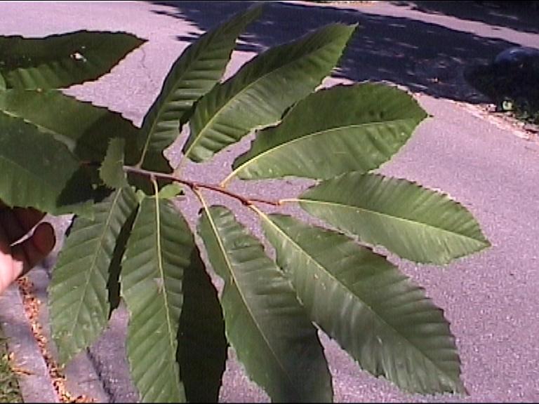 Das Esskastanienblatt ist am Rand buchtig gezähnt, stachel-spitzig und die Oberfläche ist glänzend. Das Blatt hat eine längliche lanzettähnliche Form und netzartige Blattadern, die stark hervortreten. Es hat eine wechselständige Blattstellung. Auf dem Bild ist ein Zweig mit mehreren Blättern zu sehen. |