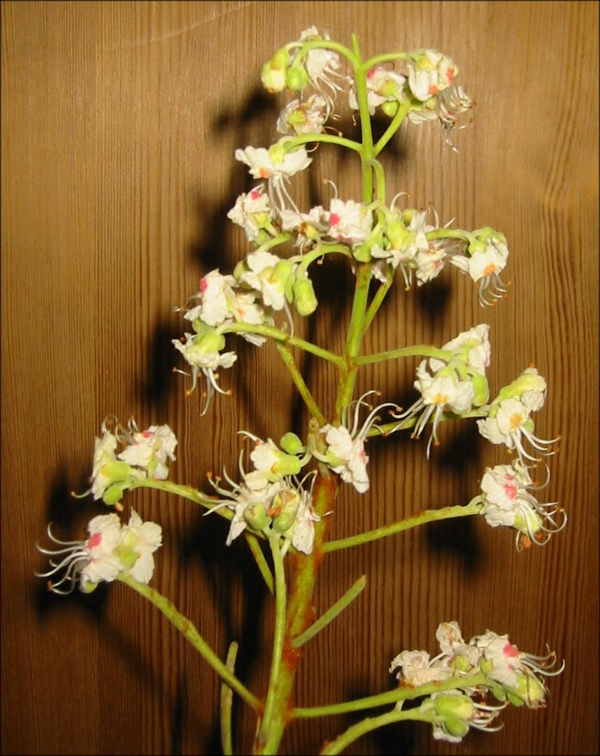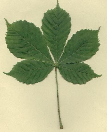 Die Roßkastanie ist ein bis zu 25 m hoher Baum. Die Blätter sind gegenständig gefingert, die Blüten in der Zeit von Mai- Juni weiß mit gelben oder roten Flecken. Ihre Heimat hat die Roßkastanie in Nordgriechenland. Ihre Früchte sind für den Menschen nicht genießbar. Sie taugen höchstens für das Vieh. |