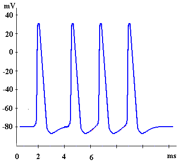 Hier wurde der Neurit nicht nur einmalig gereizt sondern mehrfach kurz hintereinander. Die Erregungen im Axon sind unten abgebildet, die im Soma ganz unten. ![]() |