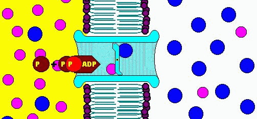 ... so wird die Natrium-Kalium-Pumpe aktiviert, die beiden Ionen werden den gegenüberliegenden Seiten zugeordnet und das ATP zu ADP und P gespalten.