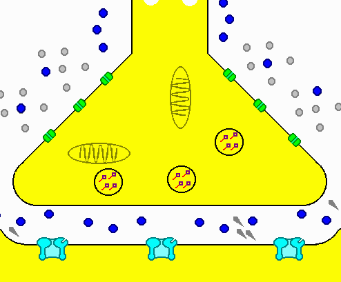 Im oberen präsynaptischen Teil erkennt man neben Mitochondrien, mit Überträgerstoff (Transmitter) gefüllte Vesikel und geschlossene Ca2+-Poren in der seitlichen Membran.
