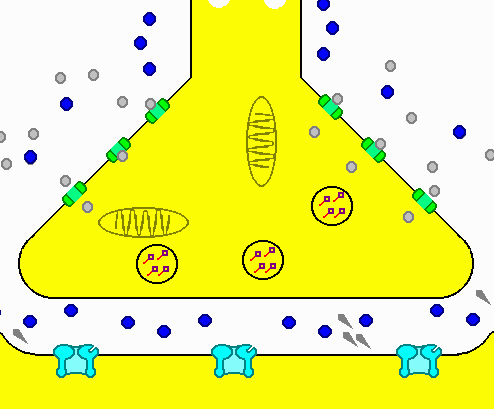 Ablauf der Erregungsübertragung an Synapsen Durch die offenen Calcium-Kanäle gelangen Ca2+- Ionen in das Innere des Endknöpfchens. [zur vorhergehenden Seite] mit einem Browser, der das Presentermodul nicht unterstützt, [zur nächsten Seite]