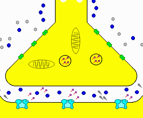 Der in den synaptischen Spalt ausgeschüttete Transmitter Acetylcholin diffundiert durch den synaptischen Spalt zu den Rezeptoren an der postsynaptischen Membran. [zur vorhergehenden Seite]