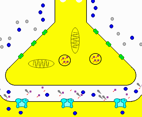 Der Transmitter Acetylcholin wird vom Enzym Cholinesterase in die am Rezeptor unwirksamen Teile Cholin und Acetat-Ionen gespalten. [zur vorhergehenden Seite]