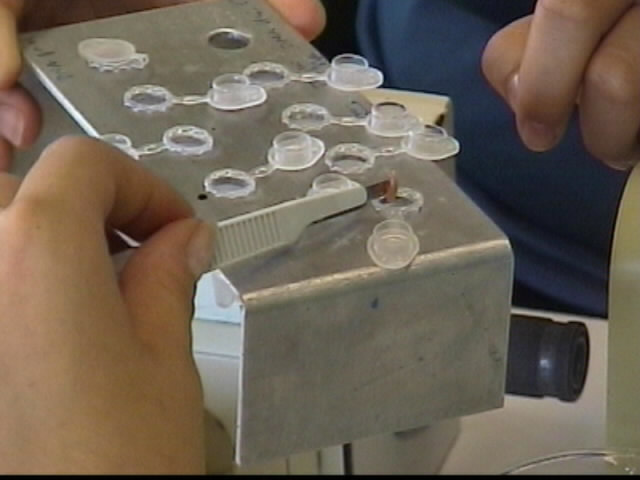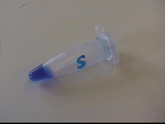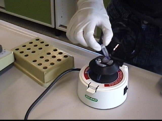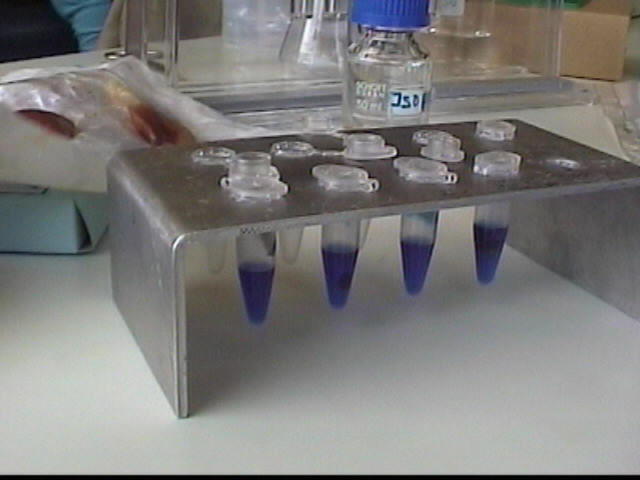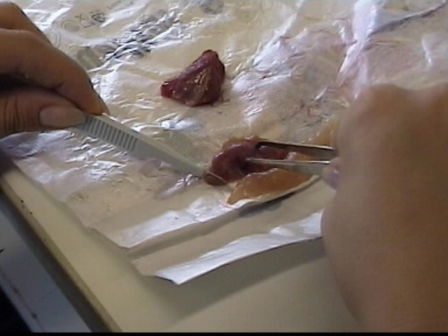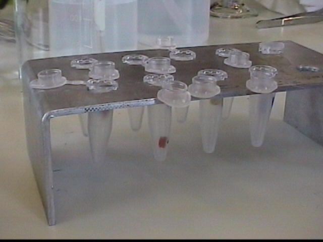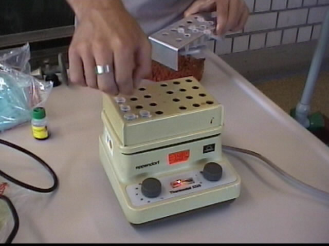 2) Vom Fleisch werden jeweils etwa 100 mg-Portionen abgetrennt; das entspricht ungefähr einer Messerspitze. Die Proben werden in den Eppendorf-Hütchen mit 500 mül Puffer versetzt und für 10 min bei 95°C im Thermoblock inkubiert. Die Deckel der Hütchen müssen durchstochen werden, um Überdruck zu verhindern. 3) Die Proben werden anschließend für 1 min bei 6000 rpm zentrifugiert.