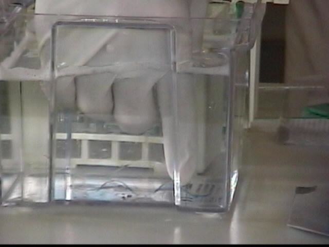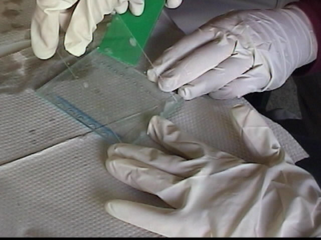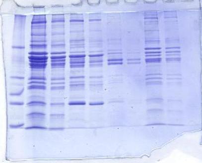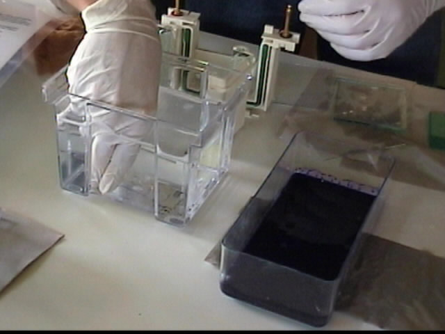 Abbau der Apparatur1) Alle Bestandteile der Apparatur werden in umgekehrter Reihenfolge wieder auseinander genommen, bis die Gelkassette mit den Gelen vorliegt. Jedes Gel wird vorsichtig unter Anwendung beider grüner Keile abgenommen und in die Coormassie-Färbelösung gegeben. Nachdem die Färbelösung in der Mikrowelle auf etwa 80°C gebracht wurde, werden die Gele für etwa 20 min auf dem Schüttler geschwenkt. ![]()