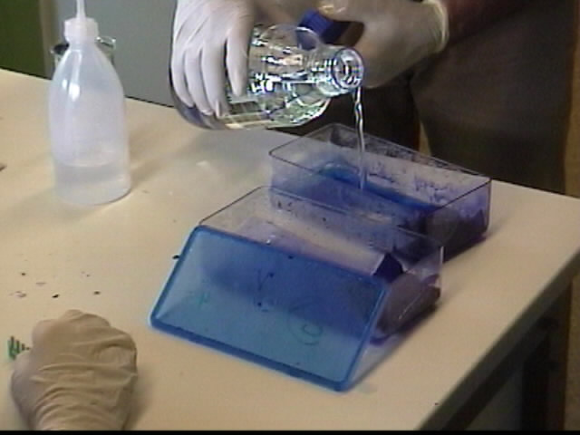 Zugabe des Entfärbers2) Die Färbelösung wird in die Vorratsflasche zurückgegossen, wobei Spritzer möglichst vermieden werden sollen! Die Gele werden mit 100 ml Entfärber erneut in der Mikrowelle erwärmt und anschließend geschüttelt. ![]()
